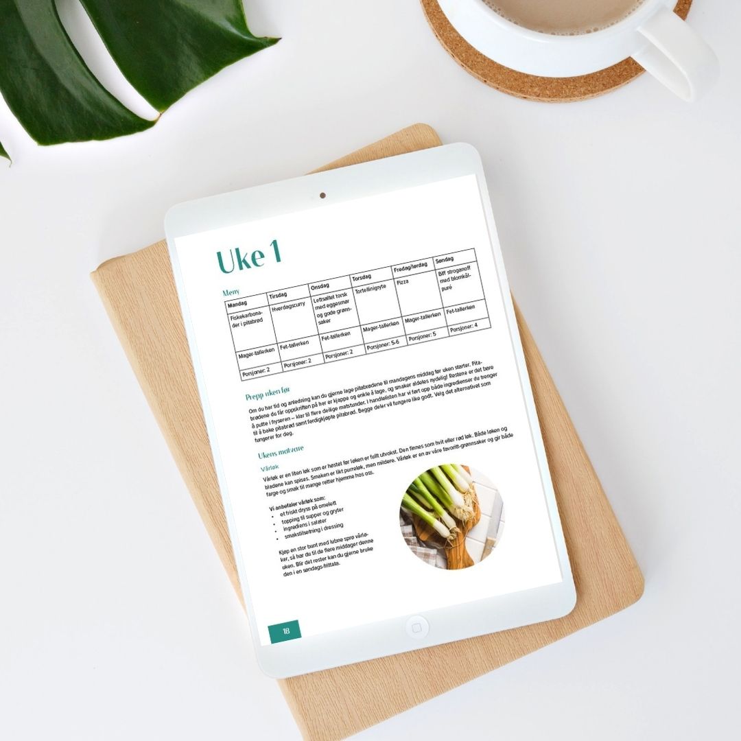 Vi har gjort jobben for deg slik at du kan få en roligere hverdag med mer matglede. Vi har planlagt dine middager for 4 uker, skrevet handlelistene dine og lagt en plan for hvordan du kan spare både tid, penger og kaste mindre mat.