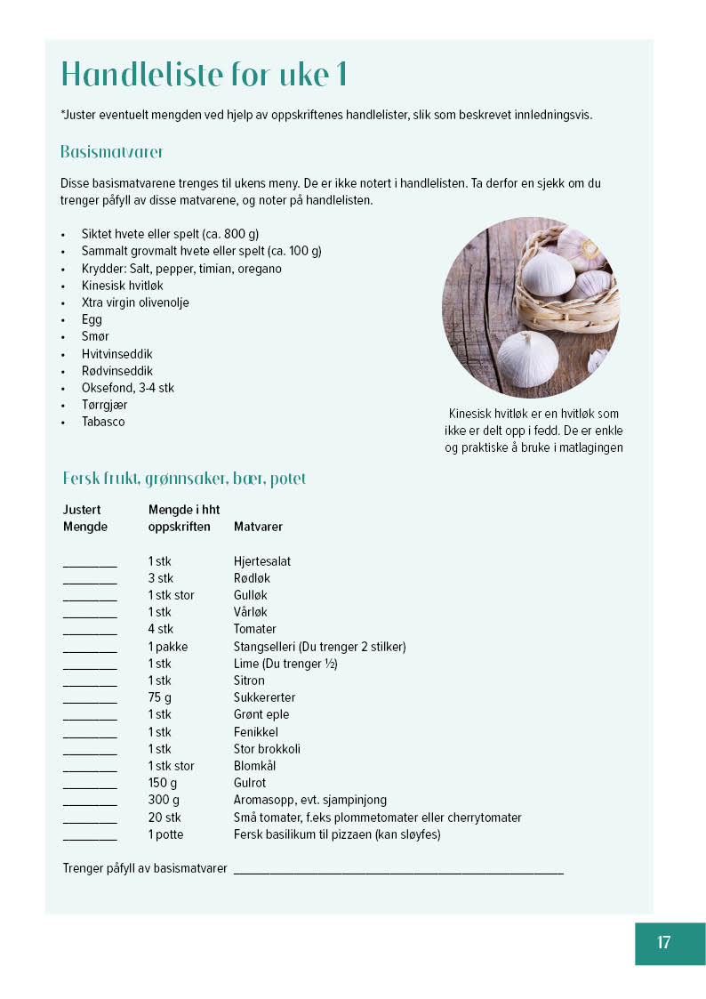 - Komplette handlelister for hver uke med mulighet for personlig tilpasning